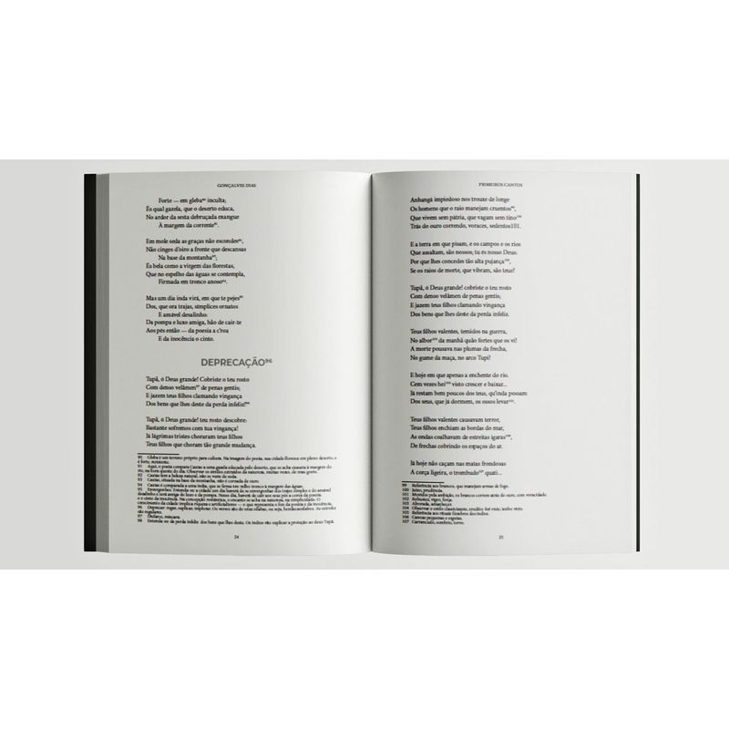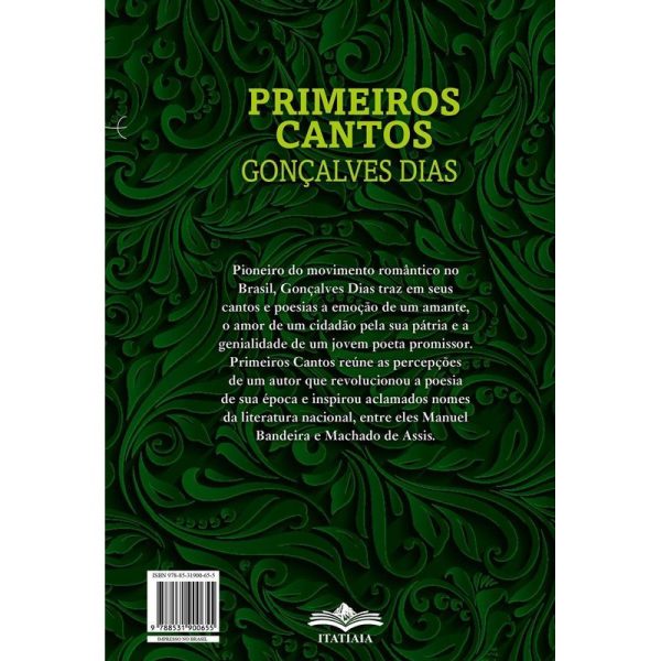 Este livro apresenta ao leitor o primeiro conjunto de poemas publicado por Gonçalves Dias nasceu em 10 de agosto de 1823.Além dos Primeiros Cantos escreveu Segundos Cantos, Sextilhas de Frei Antão e indianistas.Foi reconhecido por esta alcunha Poeta Indianista;Primeiros Cantos são poemas dispares sem o acordão de tempo e espaço, escritos e guardados a seleta tornou-se livro em 1846;com todo o barroquismo parnasianismo da época revela a visão do jovem poeta no inicio do século XIX,