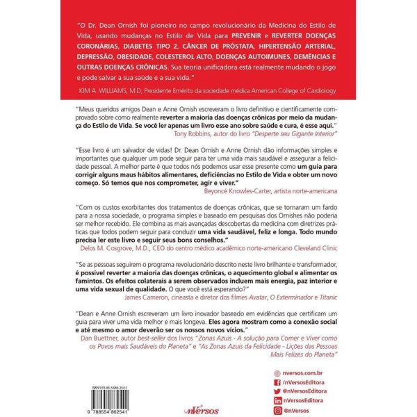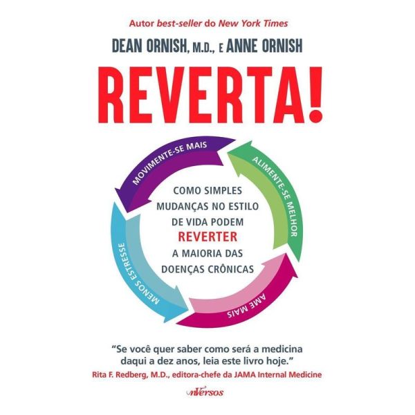 REVERTA! – Como Simples Mudanças no Estilo de Vida Podem Reverter a Maioria das Doenças Crônicas Dean Ornish é médico e pioneiro na prática da Medicina do Estilo de Vida. Dirigiu pesquisas revolucionárias provando pela primeira vez que as mudanças no estilo de vida podem,muitas vezes, reverter a progressão de diversas doenças crônicas e auxiliar em uma melhor qualidade de vida. Tais informações foram pautadas em sua experiência médica e nos seus quarenta anos de pesquisas científicas. Muito sobre o seu trabalho foi publicado nas principais revistas médicas e em periódicos norte-americanos. Reverta! é o primeiro programa cientificamente comprovado que ajuda a reverter doenças crônicas, assim como prevenir, tratar e reduzir os sintomas de doenças como: câncer, hipertensão arterial, diabetes, obesidade, depressão, ansiedade, demências, doenças autoimunes, doenças cardíacas e até mesmo retardar o processo de envelhecimento das células, aumentar a longevidade e otimizar as quatro áreas mais importantes para a sua qualidade de vida: alimentação, vida sentimental, gerenciamento de estresse e prática de atividades físicas. “Se você quer saber como será a medicina daqui a dez anos, leia este livro hoje.” Rita F. Redberg – editora-chefe da JAMA Internal Medicine