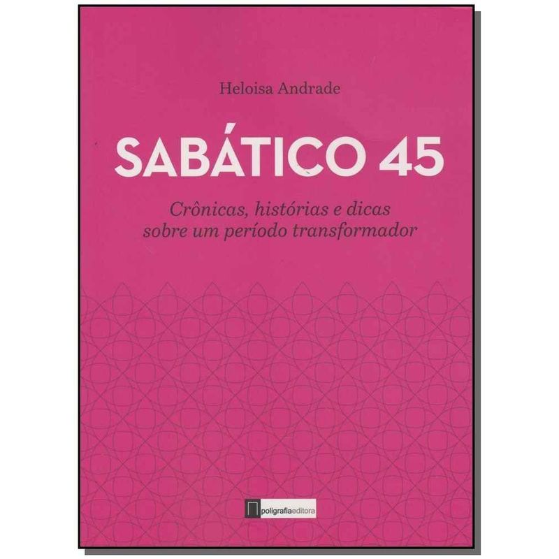 No livro “Sabático 45 – Crônicas, histórias e dicas sobre um período transformador”, a autora Heloisa Andrade compartilha com o leitor de forma franca e direta, por meio de crônicas, suas experiências em um dos períodos mais transformadores de sua vida. E mais, dá ao leitor a opção de pensar e preparar o seu próprio Sabático, levando sempre em conta os aspectos práticos (Razão) e emocionais (Coração) que uma decisão dessas exige. Viajando pelo sabático com a autora, o leitor vai conhecer os desafios enfrentados na tomada da decisão, os detalhes exigidos na preparação, as alegrias, descobertas da experiência em si e as impressões finais sobre esse importante período. A autora, que tem a escrita e a literatura como norte e paixões em sua vida, consegue tratar o tema com profundidade, mas ao mesmo tempo, com leveza.
