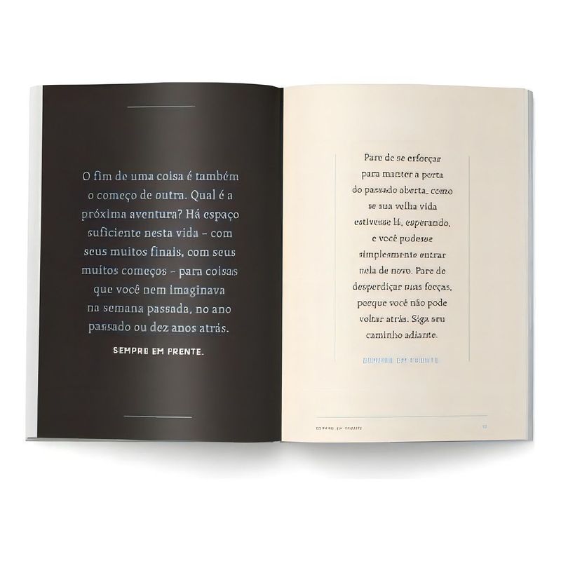 Logo após seu divórcio, a poeta norte-americana Maggie Smith começou a postar frases inspiracionais no Twitter como uma forma de lembrar a si mesma que poderia superar o término de sua relação. A humanidade contida em seus textos fez seus posts viralizarem, alcançando milhares de pessoas. Neste livro profundamente tocante, composto por frases e ensaios breves, Maggie escreve sobre recomeços serem oportunidades de transformação. Como o kintsugi – a arte japonesa de remendar com ouro a cerâmica quebrada –, Sempre em frente celebra a beleza e a força que existem no outro lado da perda. Este é um livro reconfortante para quem passou por momentos difíceis e agora tenta lidar com a própria dor