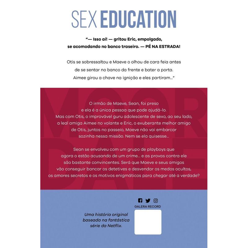 A aclamada série da Netflix em uma história inédita com seus personagens favoritos. Em Sex Education: Pé na estrada acompanhe Maeve, Otis, Eric e Aimee em uma aventura para solucionar um mistério. O irmão de Maeve, Sean, se meteu em (mais) uma encrenca. Mas dessa vez a coisa parece estar bem séria. Um grupo de playboys o acusa de roubo e as provas parecem irrefutáveis. Se ele não conseguir limpar seu nome, a prisão será seu novo endereço. Disposto a provar a inocência, ele aciona a inteligente e esperta Maeve. Mesmo sem estar segura sobre a inocência do irmão, ela é a única com quem Sean pode contar. E ela não daria as costas para ele.Mas Maeve não estará sozinha nessa missão. Com Otis, o improvável guru adolescente de sexo, ao seu lado, a leal amiga Aimee no volante e Eric, o exuberante melhor amigo de Otis, os quatro colocarão todas as suas habilidades de detetive à prova para descobrir o que realmente aconteceu e tentar livrar Sean da confusão.Entre sobreviver uns aos outros, solucionar um crime de verdade e lidar com as emoções da viagem, os amigos de Moordale farão uma jornada que promete ser inesquecível.Apesar de ser ambientado no universo da série, o livro apresenta uma história independente. Mas traz tudo o que os fãs mais amam em Sex Education: grandes amizades, amadurecimento, autoconhecimento, honestidade e aventuras hilárias.E não há spoiler! A história do livro complementa, mas não revela nada sobre a série.*A série Sex Education é elogiada por abordar tópicos importantes como sexualidade, identidade e relacionamentos. A primeira temporada foi vista em 40 milhões de lares nas primeiras quatro semanas e é amplamente celebrada por retratar a maneira como os adolescentes lidam com sexo com honestidade e sensibilidade.