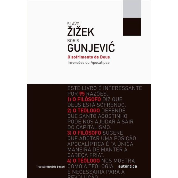 O sofrimento de Deus: inversões do Apocalipse é uma análise e uma reconstrução brilhante dos três maiores sistemas de crença da atualidade. Um debate entre Slavoj Žižek, um dos intelectuais mais articulados do mundo, e o filósofo croata Boris Gunjevi?, teólogo radical. Em seis capítulos que descrevem o cristianismo, o islã e o judaísmo usando as ferramentas da análise hegeliana e lacaniana, o livro mostra como cada sistema religioso entende a humanidade e a divindade, e como as diferenças entre eles podem ser muito mais estranhas do que parecem à primeira vista. Os debatedores nos oferecem uma investigação crítica, não um texto religioso. Com uma dedicação contagiosa e uma genialidade para realizar conexões improváveis, Žižek põe em xeque o suposto ateísmo ocidental e contempla a ideia desconcertante de um Todo-Poderoso que tanto sofre quanto ora. Partindo das artimanhas de Žižek e apresentando outras, Gunjevi? faz a convocação revolucionária de uma teologia que enfraqueça a astuciosa “escravização do desejo” do mundo capitalista. Com exemplos marcantes e uma lógica afiada, Žižek e Gunjevi? evocam pensadores que vão de Agostinho a Lacan, e discussões que incluem a dualidade entre ética cristã e pagã, a “luta de classes” subentendida na leitura do Alcorão e o papel do gênero no islã. Juntos, eles confirmam e analisam a fé no século XX, abalando as estruturas das tradições abraâmicas.