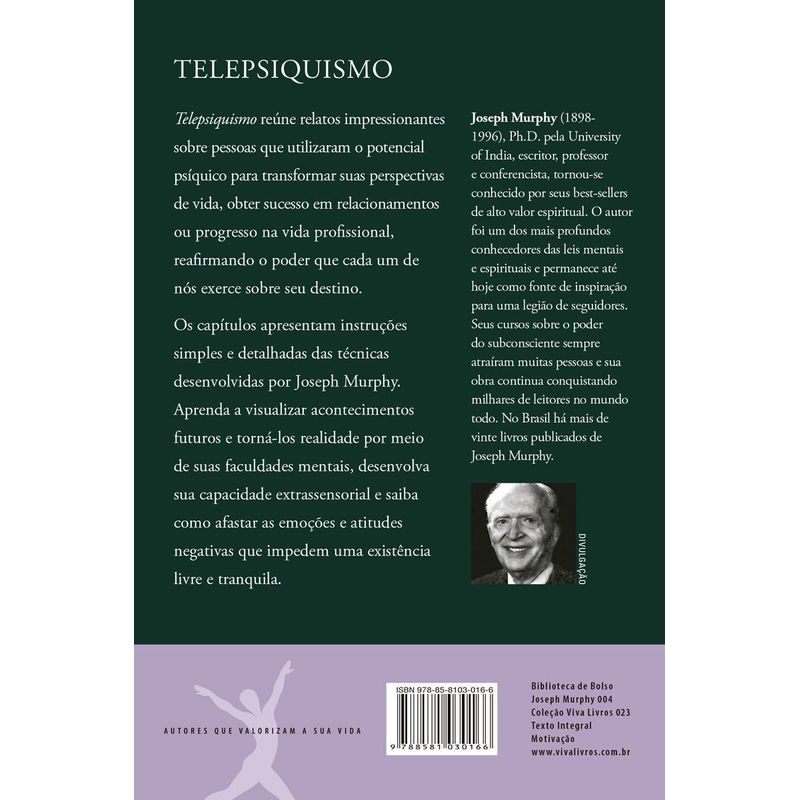 Edição de bolso deste livro do escritor best-seller Joseph Murphy. Telepsiquismo reúne relatos impressionantes sobre pessoas que utilizaram o potencial psíquico para transformar suas perspectivas de vida, obter sucesso em relacionamentos ou progresso na vida profissional. Em cada capítulo você encontrará instruções simples e detalhadas das técnicas desenvolvidas por Joseph Murphy que lhe permitirão levar uma vida mais plena Telepsiquismo, você aprenderá a visualizar acontecimentos futuros e torná-los realidade por meio de suas faculdades mentais, desenvolverá sua capacidade extrassensorial e saberácomo afastar as emoções e atitudes negativas que impedem uma existência livre e tranquila. Esta é mais uma obra de Joseph Murphy, autor de mais de 30 livros de autoajuda, muitos deles best-sellers em todo o mundo.