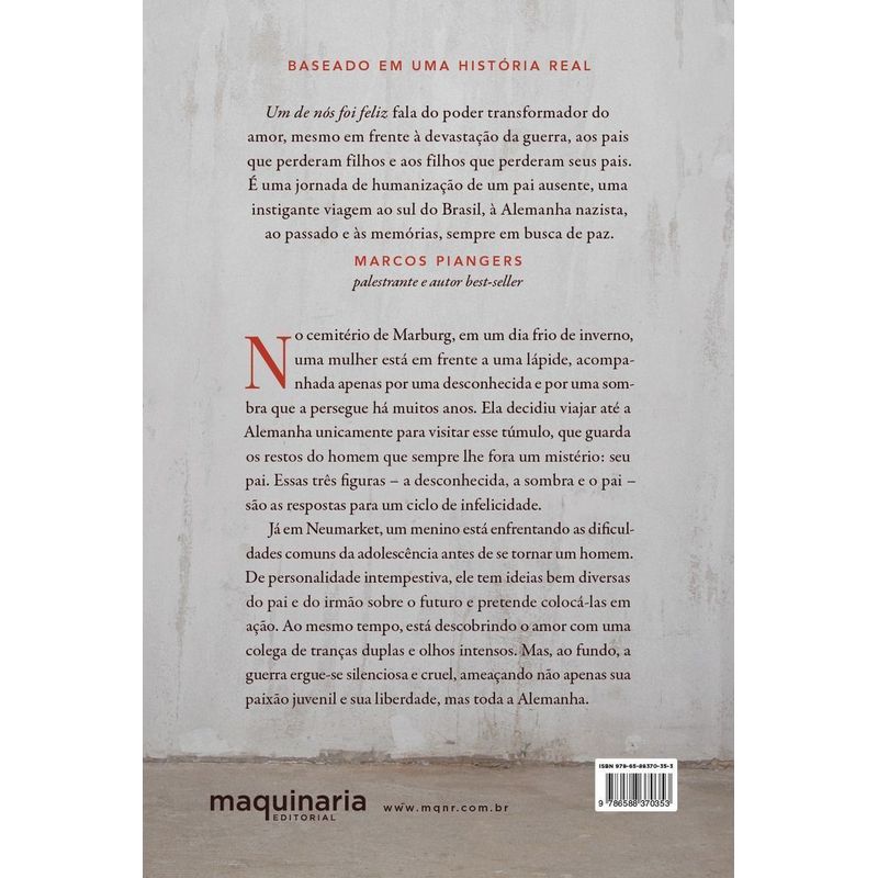 Baseado em uma história real Susana decide viajar até Alemanha. Pela primeira vez, veria a sombra com seus próprios olhos. A sombra que a acompanha desde a infância e que lhe causara dores e perguntas sem resposta a respeito de seu passado de abandono e angústia. É no cemitério de Marburg que Susana encontrará o homem que sempre lhe fora um mistério: seu pai. E é nesse mesmo local que ela conhece pessoalmente Mia Richter, a pessoa por quem procurara por anos, filha de Patrizia Richter, a mulher de seus pesadelos e de seus sonhos. Susana sabia que ambas faziam parte da sua história – só não sabia qual. A cada passo dado, ela sente a presença da sombra, perseguindo-a e suplicando por nção e um encerramento de ciclo. Nessa trajetória, Susana vai aos poucos encontrando respostas sobre o porquê seu pai abandonara a família para viver um romance antigo em outro país. Em paralelo, o passado de Jonas vai sendo narrado e todos os fatos importantes que o levaram a esse destino. Ele, afinal, fora feliz? E Susana? Quem dos dois fora? Dentre sua mãe e seus irmãos, Susana é a única capaz de saber a verdade e perdoá-lo. “Um de nós foi feliz” fala do poder transformador do amor, mesmo em frente à devastação da guerra, aos pais que perderam filhos e aos filhos que perderam seus pais. É uma jornada de humanização de um pai ausente, uma instigante viagem ao sul do Brasil, à Alemanha nazista, ao passado e às memórias, sempre em busca de paz. – MARCOS PIANGERS palestrante e autor best-seller Romancear uma história real é tarefa complexa até para escritores mais experientes: como encontrar o fino equilíbrio entre realidade e ficção? Ao reconstituir o passado de uma família, Paulo Stucchi adiciona suas próprias emoções e palavras, de modo a contar a trajetória de suas personagens com maior fidelidade e precisão. Uma grande história de amor alinhada à história recente da humanidade. CLAUFE RODRIGUES, jornalista, compositor e poeta