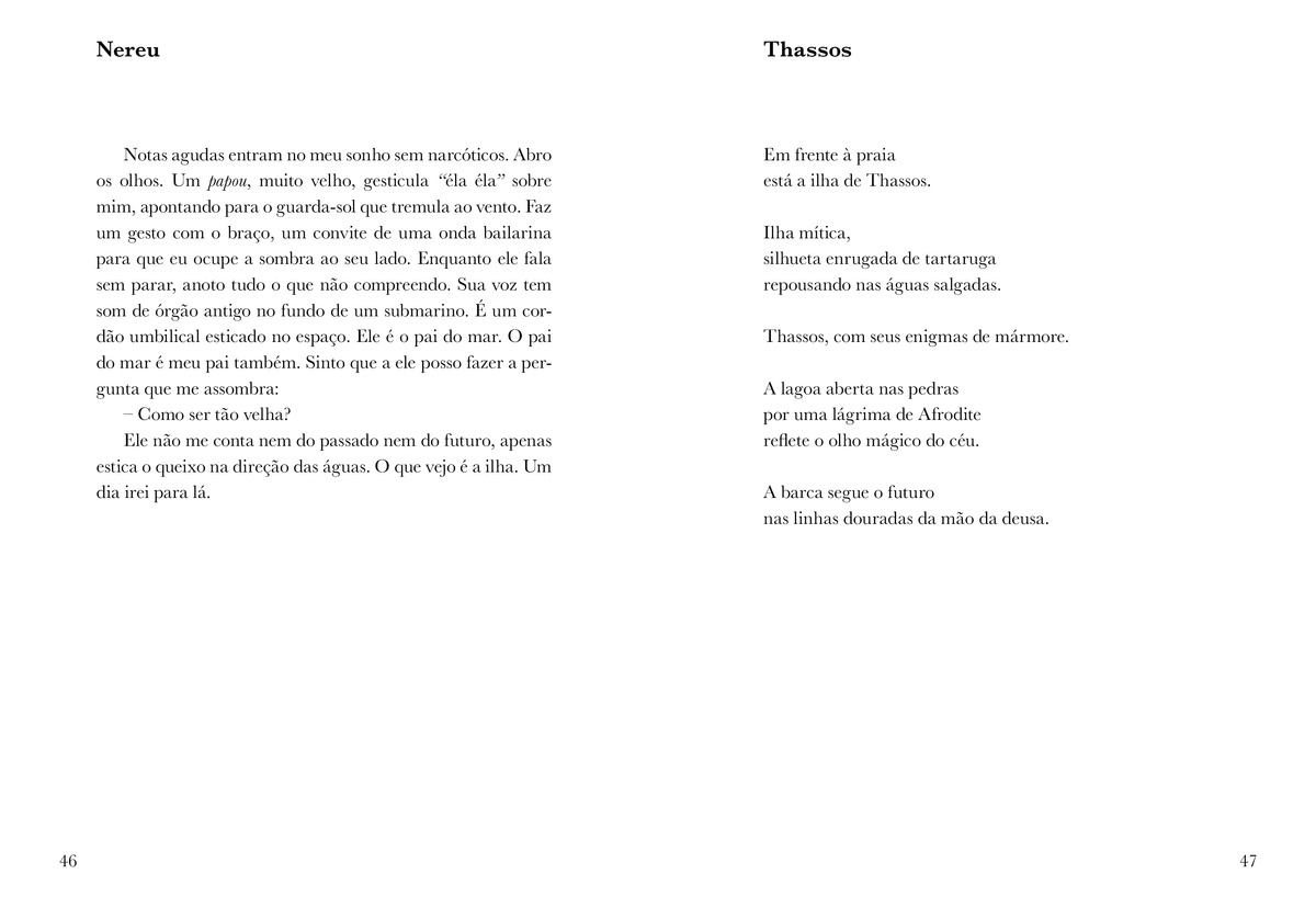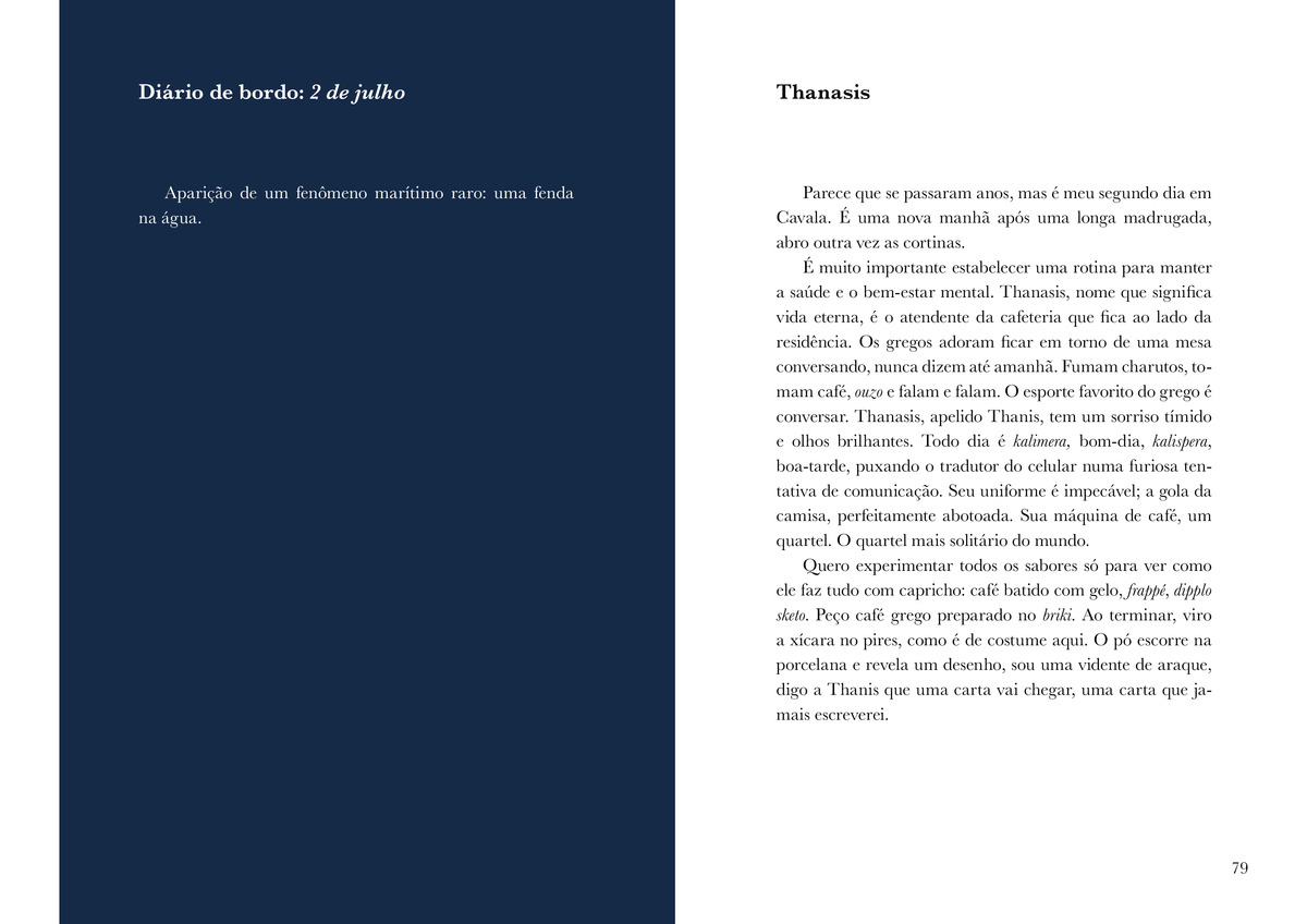 Um Quarto em Cavala é, antes de tudo, uma reflexão sobre o paradoxo da existência. Vita, conduzida por uma força que mal compreende, atravessa fronteiras para confrontar o vazio. Sua viagem não é apenas um deslocamento físico; é uma renúncia à segurança de uma vida definida por limites invisíveis, uma busca pela sua essência. O quarto em Cavala não é refúgio nem prisão, mas um lugar suspenso, onde o passado e o presente se entrelaçam, fazendo surgir a experiência poética. A viagem de Vita, mais do que física, é uma jornada filosófica e criativa. O espaço exterior — Cavala, com suas paisagens e mitos — espelha o mergulho interior em um mar simbólico de memórias, medos e possibilidades. E também o encontro com outras linguagens. A narrativa propõe uma reflexão profunda sobre os caminhos que se bifurcam entre a solidão e o pertencimento, entre a voz interna e os ecos de mulheres artistas e mitológicas que, ao longo do tempo, deixaram suas marcas. Vita, ao se encontrar com essas vozes, descobre que sua travessia não é apenas uma fuga, mas um rito de iniciação. A escrita é seu território de ancoragem e também o vento que a leva, num constante movimento entre perder-se e recriar-se. Em Um Quarto em Cavala, a viagem é apresentada como uma condição inevitável da existência humana, na qual a verdadeira liberdade só é alcançada ao aceitar-se como parte do mistério.