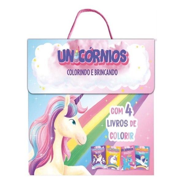 Explore o mundo mágico dos unicórnios com esta coleção divertida. São lindos desenhos para colorir e uma alça que o ajudará a levar os livros para onde quiser.