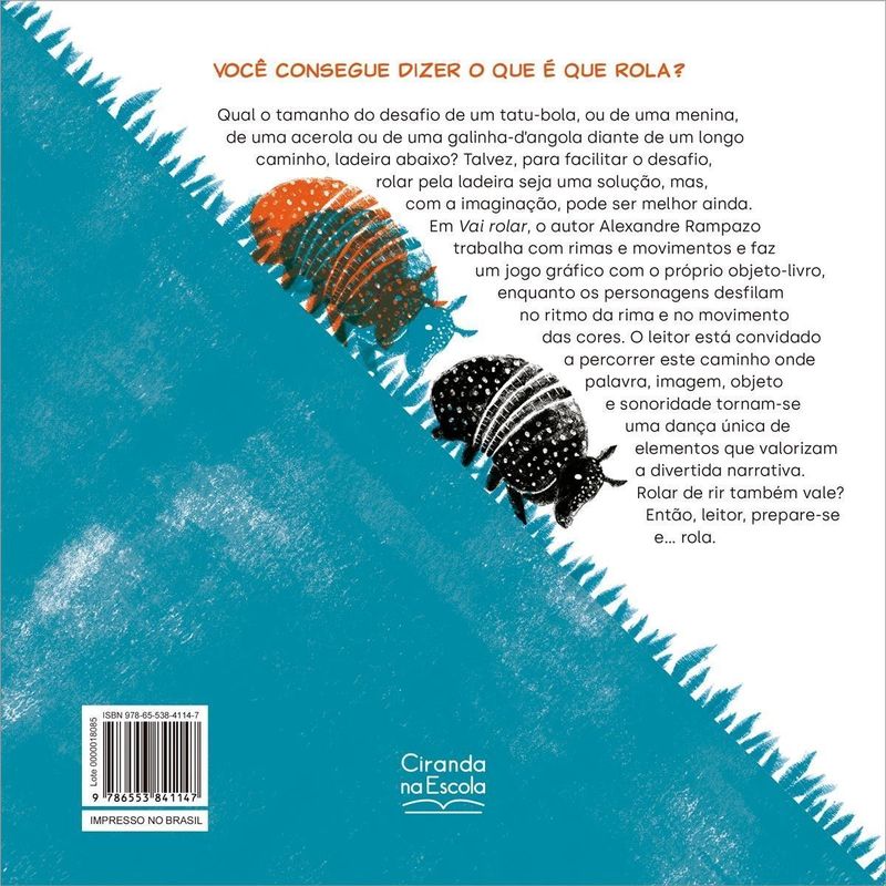 Qual o tamanho do desafio de um tatu-bola, ou de uma menina, de uma acerola ou de uma galinha-d’angola diante de um longo caminho, ladeira abaixo? Talvez, para facilitar o desafio, rolar pela ladeira seja uma solução, mas, com a imaginação, pode ser melhor ainda. Em “Vai rolar”, o autor Alexandre Rampazo trabalha com rimas e movimentos e faz um jogo gráfico com o próprio objeto-livro, enquanto os personagens desfilam no ritmo da rima e no movimento das cores. O leitor está convidado a percorrer este caminho onde palavra, imagem, objeto e sonoridade tornam-se uma dança única de elementos que valorizam a divertida narrativa. Rolar de rir também vale? Então, leitor, prepare-se e… rola.