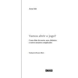Um convite para falar sobre assuntos espinhosos. Anna Sale quer que você tenha aquela conversa. Você sabe qual. Aquela que está evitando ou adiando, talvez por anos a fio, com a desculpa de eles nunca vão entender ou será que quero mesmo trazer isso à tona? ou isso não vai dar certo, então por que tentar? . Dividido em cinco capítulos – morte, sexo, dinheiro, família e identidade –, Vamos abrir o jogo? se vale de relatos fascinantes de pessoas que abriram o coração e repensaram suas opiniões para mostrar por que ter conversas sobre questões difíceis é importante e como fazer isso de forma inteligente e generosa. Anna Sale mostra que a escuta é uma parte muito importante de uma conversa difícil e que nem sempre a reconciliação é possível. Algumas coisas as palavras não conseguem corrigir, mas isso não é realmente um problema. Sobre a obra: Criadora e apresentadora do premiado podcast Death, Sex & Money, da WNYC, Anna Sale é uma terapeuta no happy hour, como o New York Times a chamou. Ela se envolve em conversas provocativas com seus convidados e discute assuntos que a maioria das pessoas é muito relutante, educada ou tensa para abordar. Mas todos passamos por situações difíceis e, quando não conversamos a respeito, acabamos isolados e desconectados das pessoas que mais podem nos ajudar. Vamos abrir o jogo? nos convida a mergulhar nas conversas mais desafiadoras, aquelas com potencial detransformar a nossa trajetória de vida, ao melhor estilo Anna Sale: com respeito, franqueza, curiosidade, empatia e segurança. Neste livro, vamos entender que, quando temos a coragem de falar sobre questões difíceis, aprendemos sobre nós mesmos, os outros e o mundo que construímos juntos.