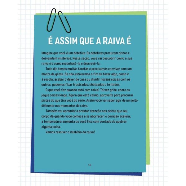 50 ATIVIDADES PARA LIDAR COM A RAIVA E SE SENTIR MELHOR. Práticas divertidas para manter a calma e tomar melhores decisões nos momentos difíceis. Conheça a raiva. A raiva é uma emoção normal, como a alegria, a tristeza e o medo. Mas às vezes ela quer tomar conta de tudo e mandar em você – isso tira qualquer um do sério! A boa notícia é que VOCÊ é muito mais esperto que a raiva. Este livro vai lhe dar um monte de dicas incríveis para não deixar que ela assuma o comando. Vamos lidar com a raiva apresenta atividades divertidas e interativas para você aprender mais sobre si mesmo e suas emoções. Fazendo exercícios que ensinam estratégias para controlar a raiva, você conseguirá lidar com os sentimentos desagradáveis, podendo ter uma vida mais feliz. SEJA CURIOSO E INVESTIGUE A RAIVA. Faça perguntas para conhecer melhor a raiva: Como seu corpo se sente quando você se irrita? Será que sua raiva às vezes esconde medo, tristeza ou decepção? E que tipo de impulsos ela provoca? DESCUBRA O QUE FAZ VOCÊ SENTIR RAIVA em casa, na escola, no convívio com os amigos e nas mais diversas situações. Faça dezenas de atividades para resolver o mistério da raiva! APRENDA A CONTROLAR A RAIVA QUANDO QUISER com ferramentas fantásticas, como criação de um vocabulário de sentimentos, meditações, desenhos e encenações.