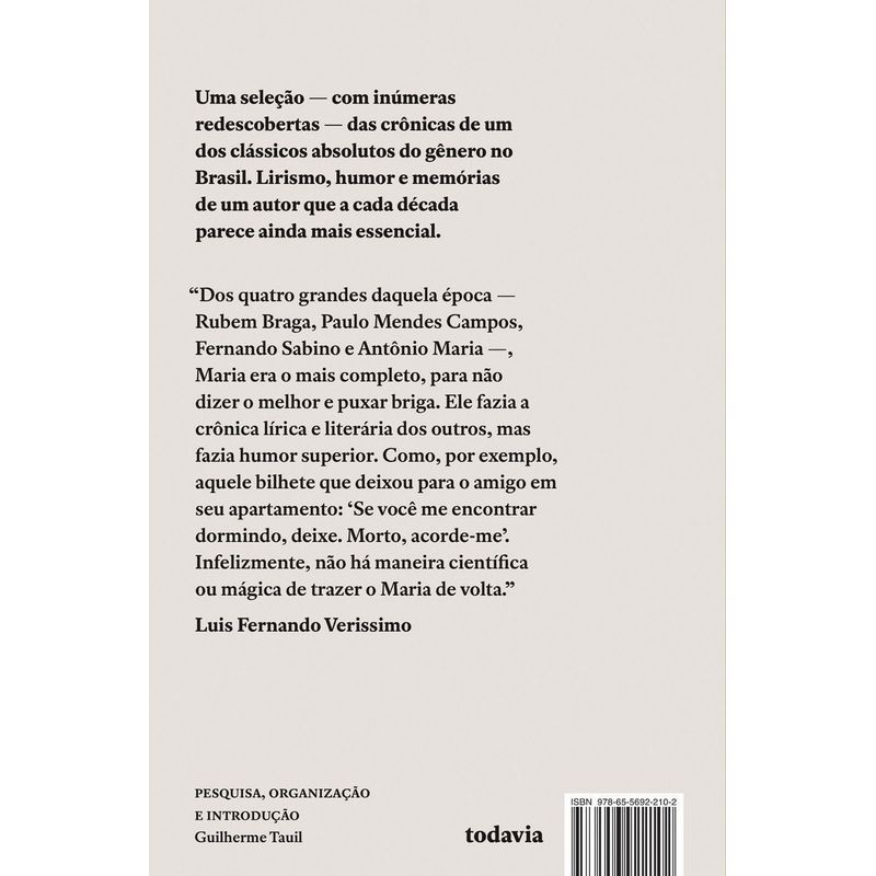 Entre os 185 textos reunidos, a grande maioria inéditos em livro, estão crônicas sobre a noite carioca, sobre os amigos. Mas neles também descortina-se outro Maria, pouco entrevisto nas seleções produzidas até agora: sua origem numa rica família pernambucana que perdeu tudo e o preconceito com nordestinos no Rio. Matéria subjacente às crônicas foi também a questão racial, já que ele era o único afrodescendente entre os cronistas mais célebres da época.