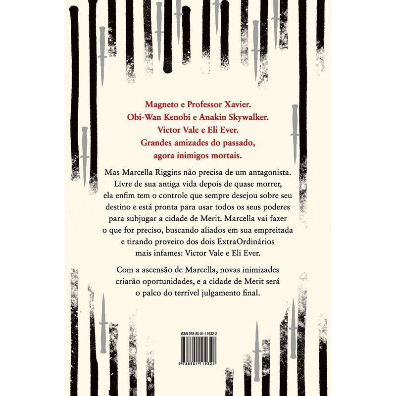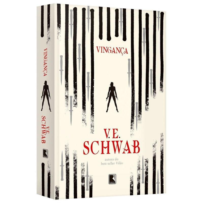 “Victor Vale e Eli Ever. Grandes amigos no passado, mas agora inimigos mortais que se enfrentam em Vingança, o capítulo final da série Vilões, de V. E. Schwab. Um mês e meio antes, Marcella tinha a vida com a qual sempre havia sonhado. Casada com Marcus, um mafioso em ascensão na cidade de Merit, ela vivia numa mansão e tinha todas as roupas e acessórios que desejava, frequentava as melhores festas e, nos bastidores, planejava com o marido os próximos passos de sua carreira. Sua vida teria seguido exatamente como o planejado, se ela não houvesse descoberto que Marcus a traía. Então, Marcella tentou esfaqueá-lo, mas Marcus era um homem forte, acostumado a matar, por isso não demorou a desacordá-la e abandoná-la para que morresse no incêndio da mansão do casal. Mas esse não seria o fim de Marcella… Cinco anos antes, Victor Vale morreu. Porém, depois do embate com seu antigo amigo de faculdade, Eli Cardale – ou Eli Ever, o assassino de ExtraOrdinários –, Sydney Clarke o trouxe de volta à vida. Mas os poderes da menina tinham limitações, e Victor não ressuscitou exatamente como era. Então, ele passou a dedicar sua vida em busca de uma cura, caçando EOs com poderes capazes de ajudá-lo. Cinco anos antes, Eli Ever foi preso. Após deixar um rastro de cadáveres de EOs, os quais, segundo ele, eram uma afronta a Deus, Eli caiu numa armadilha preparada por Victor. Então, sob custódia de uma nova força-tarefa responsável por lidar com casos envolvendo ExtraOrdinários, ele se tornou uma ferramenta dessa instituição. Com isso, Eli se manteve informado sobre os acontecimentos externos, que alimentaram sua suspeita de que ele não havia testemunhado o verdadeiro fim de Victor. Agora, Merit é o palco de um novo confronto capaz de alterar a balança do poder para sempre. E os caminhos de Marcella, Victor e Eli estão fadados a se cruzar em um encontro que vai definir a vida de todos em Vingança, a conclusão explosiva da série Vilões. “Os leitores não vão conseguir largar essa história sobre poder e vingança.” – Kirkus Reviews “